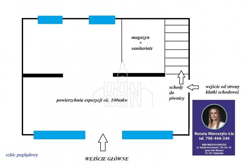 Rozkład pomieszczeń: recepcja (open space), pomieszczenie socjalne (magazyn, aneks kuchenny, wc), schody do piwnicy (magazyn)